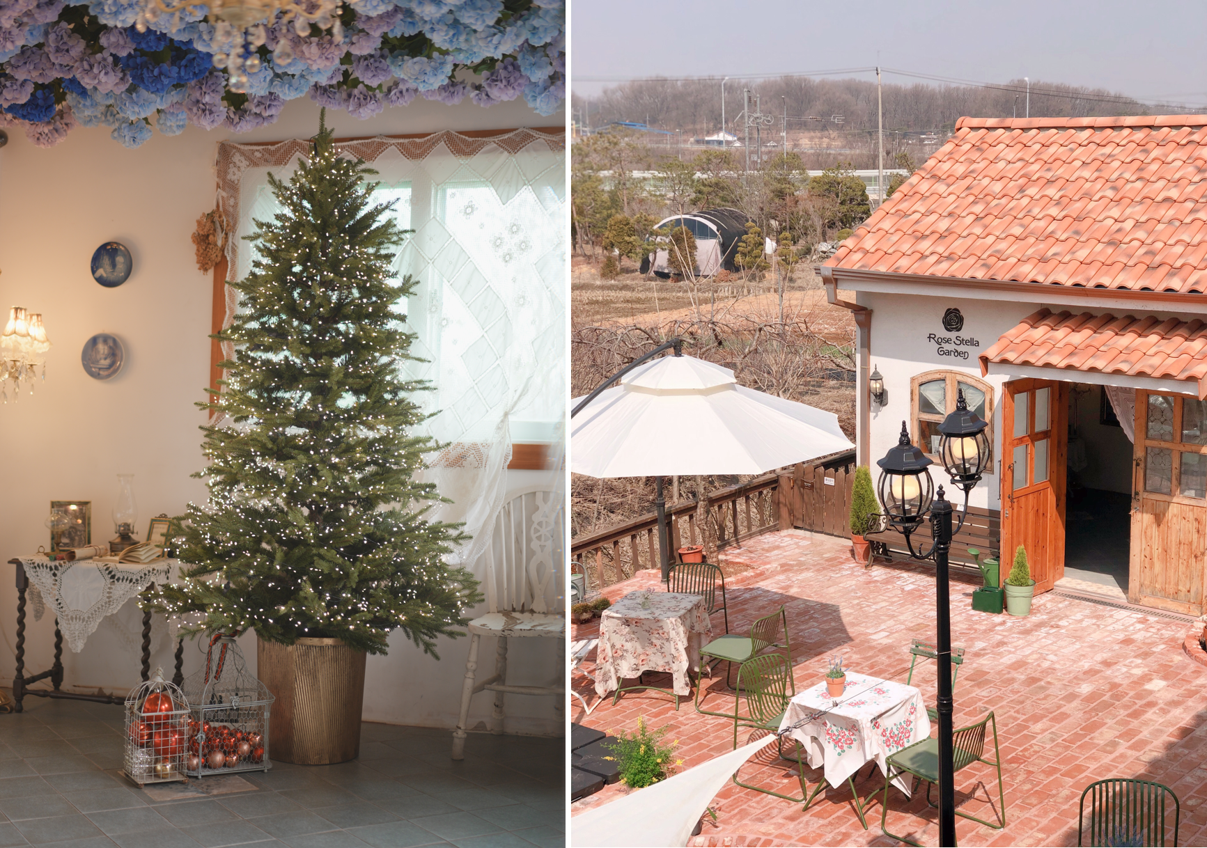 메인 건물은 주택을 개조하였는데 편안함과 동화 속에 온 것 같은 기분을 느낄 수 있습니다. 테이블마다 세팅이 달라 선택의 기쁨이 있습니다. 야외정원은 천연잔디와 벽돌로 바닥을 채워 이국적인 느낌을 살릴 수 있습니다. 정원에도 테이블이 있으니 여유롭게 차를 마실수 있습니다. 실내에는 천장에 수국으로 채워져 있으며 대형 트리가 있습니다. 정원 안쪽에는 유리온실에 소품들과 다양한 수목들이 있습니다.