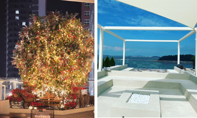 바다앞 테라스는 바다를 볼 수 있습니다. 실내는 은은한 조명들이 비취고 편안한 분위기를 형성합니다. 루프탑이 있고 중간에 테라스도 있습니다. 라탄 소품과 선인장, 흰 천 등으로 여름의 휴양지와 같은 느낌을 줍니다. 루프탑에는 조명을 화려하게 장식한 트리 감성의 나무가 있습니다. 1,2월에 가면 오렌지 나무를 볼 수 있습니다. 연말에는 딸기로 장식한 나무를 볼 수 있습니다. 매주 금, 토 8시에는 불꽃축제도 볼 수 있습니다. 1층에도 과일들이 전시되어있는 바다 앞 과일 집도 있습니다.