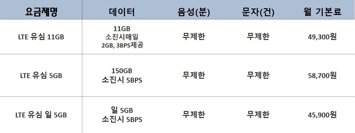 요금제는 통화량이나 데이터 사용량, 문자 등에 따라 달라지며 각 통신사마다 다를 수 있습니다.