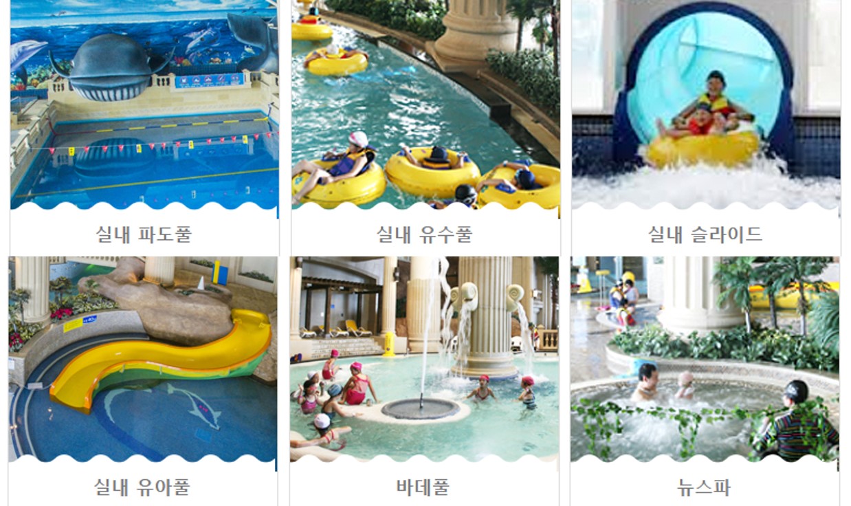 구성 : 실내파도풀, 실내 유수풀, 실내 유아풀, 비데풀, 실내슬라이드, 뉴스파, 액션풀