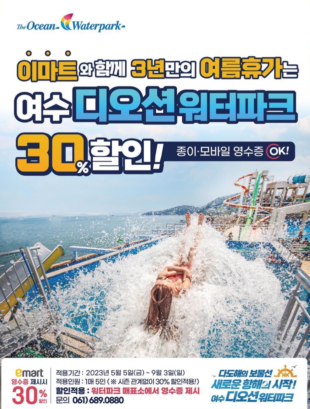 이마트와 여수디오션워터파크가 다가오는 여름을 맞이하여 통 크게 할인을 하고 있습니다.