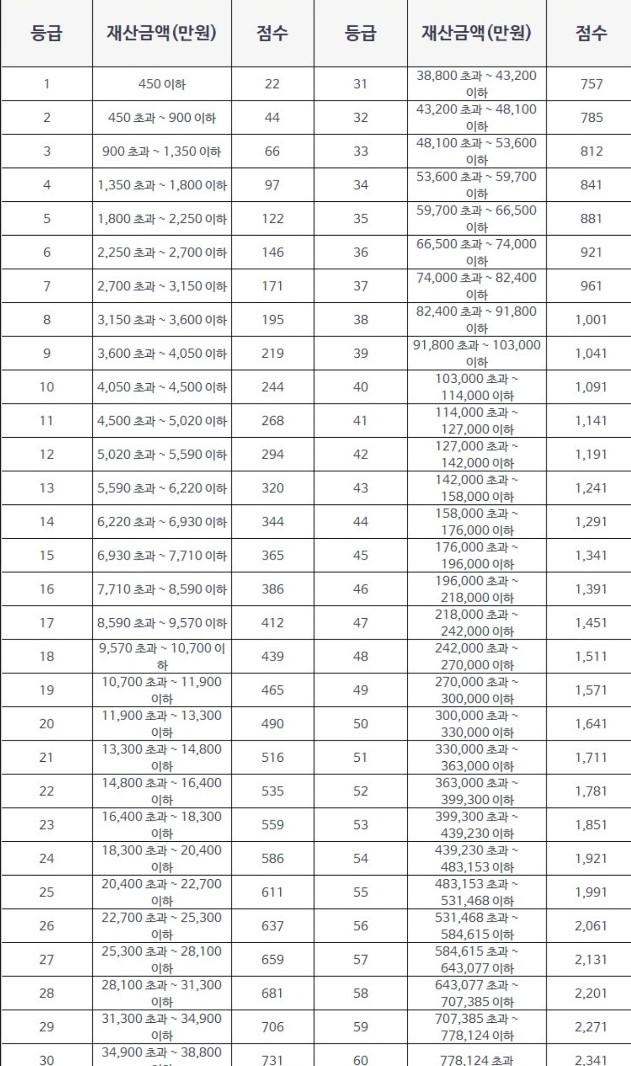 - 재산(주택, 건물, 자동차, 토지 등) 부과점수