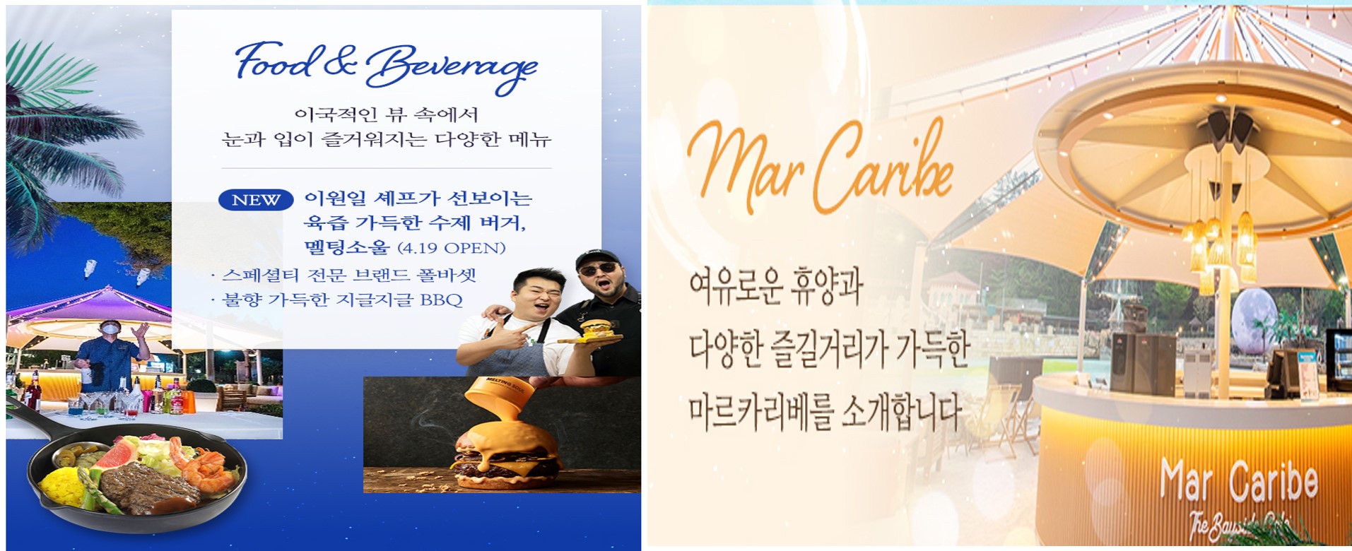단지 휴양지 해변카페가 아니라 버스킹 공연과 야외 포도풀, 포토스팟 등 다양한 체험존이 준비되어있습니다.거기에 이원일 셰프가 선보이는 육즙 가득한 수제버거까지 맛보실수 있습니다.
