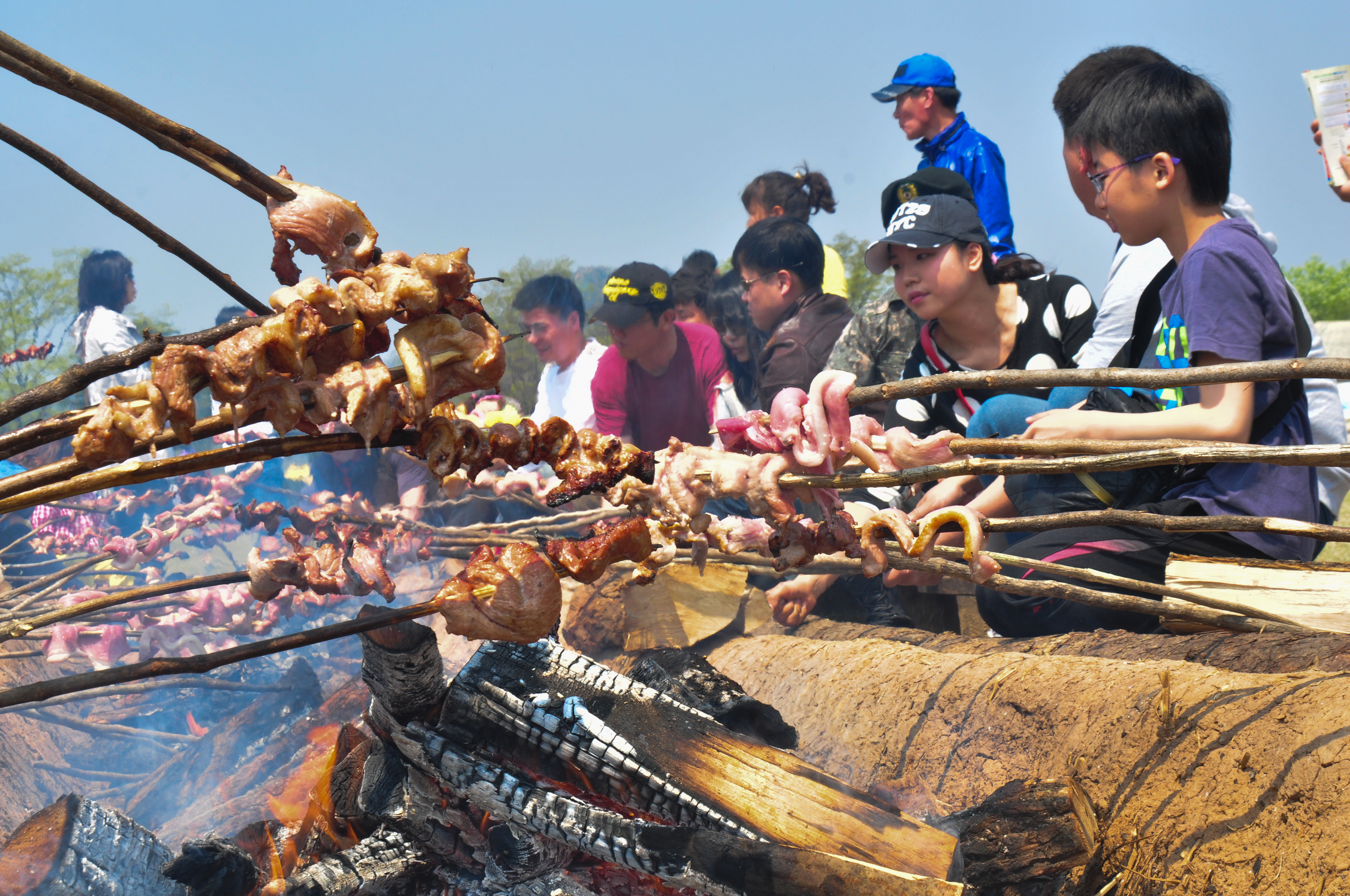 - - 1m 넘는 수제나무 꼬치에 연천의 돼지고기를 꽂아 참나무 숯불에 직접 구워 먹을 수 있음.